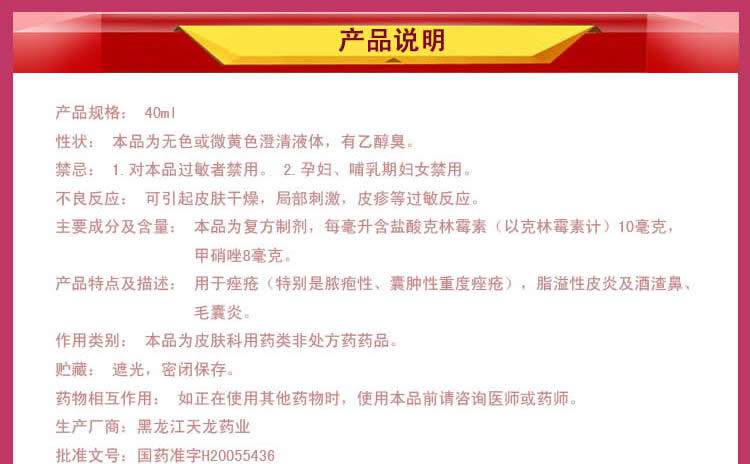 产品特点及描述: 用于痤疮(特别是脓疱性、囊肿性重度痤疮),脂溢性皮炎及酒渣鼻、毛囊炎。