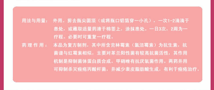 药理作用: 本品为复方制剂,其中所含克林霉素(氯洁霉素)为抗生素,抗菌谱与红霉素相似,主要对革兰阳性菌有较高抗菌活性,其作用机制是抑制菌体蛋白质合成。甲硝唑有抗厌氧菌作用。两药并用可抑制杀灭痤疮丙酸杆菌,并减少表皮脂肪酸生成,有利于痤疮治疗。